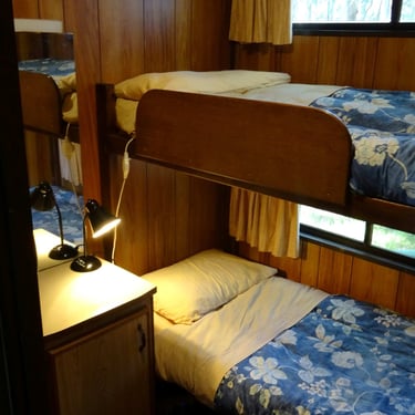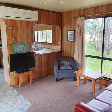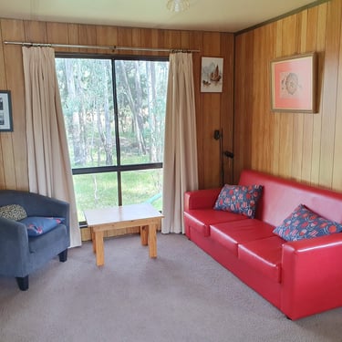 The Riverbank Lodge is fully equipped with heating, air-conditioning, television, and a gas BBQ. The kitchen has a large fridge, electric stove and microwave, with ample crockery and cutlery supplied. There are two bedrooms – a queen, and a twin room with two bunk beds. All linen, towels and bedding are supplied, and both bedrooms have been provided with electric blankets during winter.