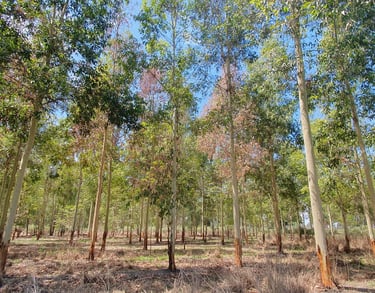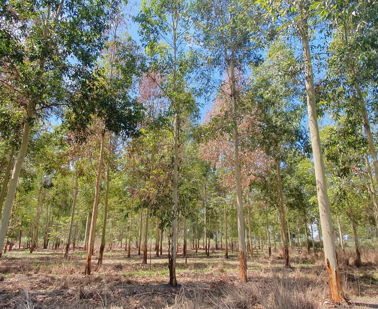 There is a yearly expansion of plantings, with favoured species being Spotted Gums (Eucalyptus maculata) and Sydney Blue Gums (Eucalyptus saligna). Trees are pruned to a height of 6.5 metres, and are now producing beautiful, high quality saw logs from selective harvesting. Logs from thinnings are used for rustic rail fences and firewood.